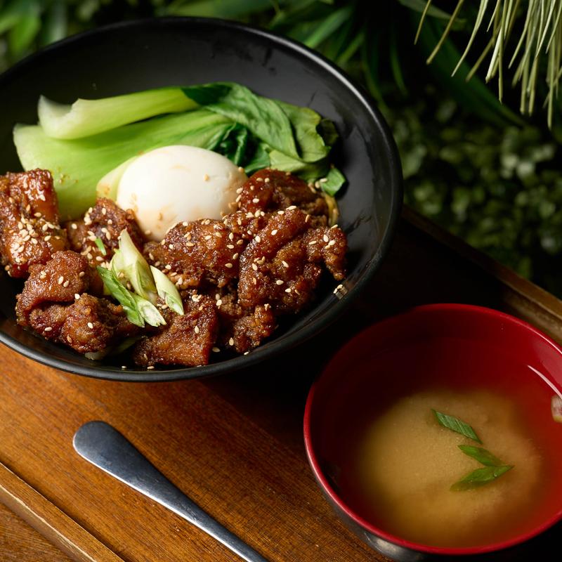 Juicy Japanese Fried Chicken over fresh steamed rice served with soft boiled egg and miso soup. Garnished with toasted sesame seeds and green onion.